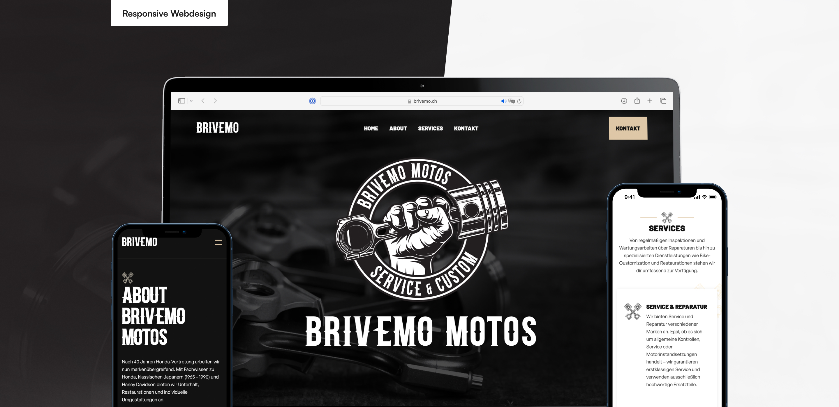 Brivemo Motos ist eine Motorradwerkstatt mit über 70 Jahren Erfahrung, spezialisiert auf Honda, Harley-Davidson und Oldtimern – von Unterhalt über Restauration bis zu Umbauten. Nach dem Halterwechsel setzen wir ein Rebranding um: Logo, Webdesign und Geschäftsdrucksachen.